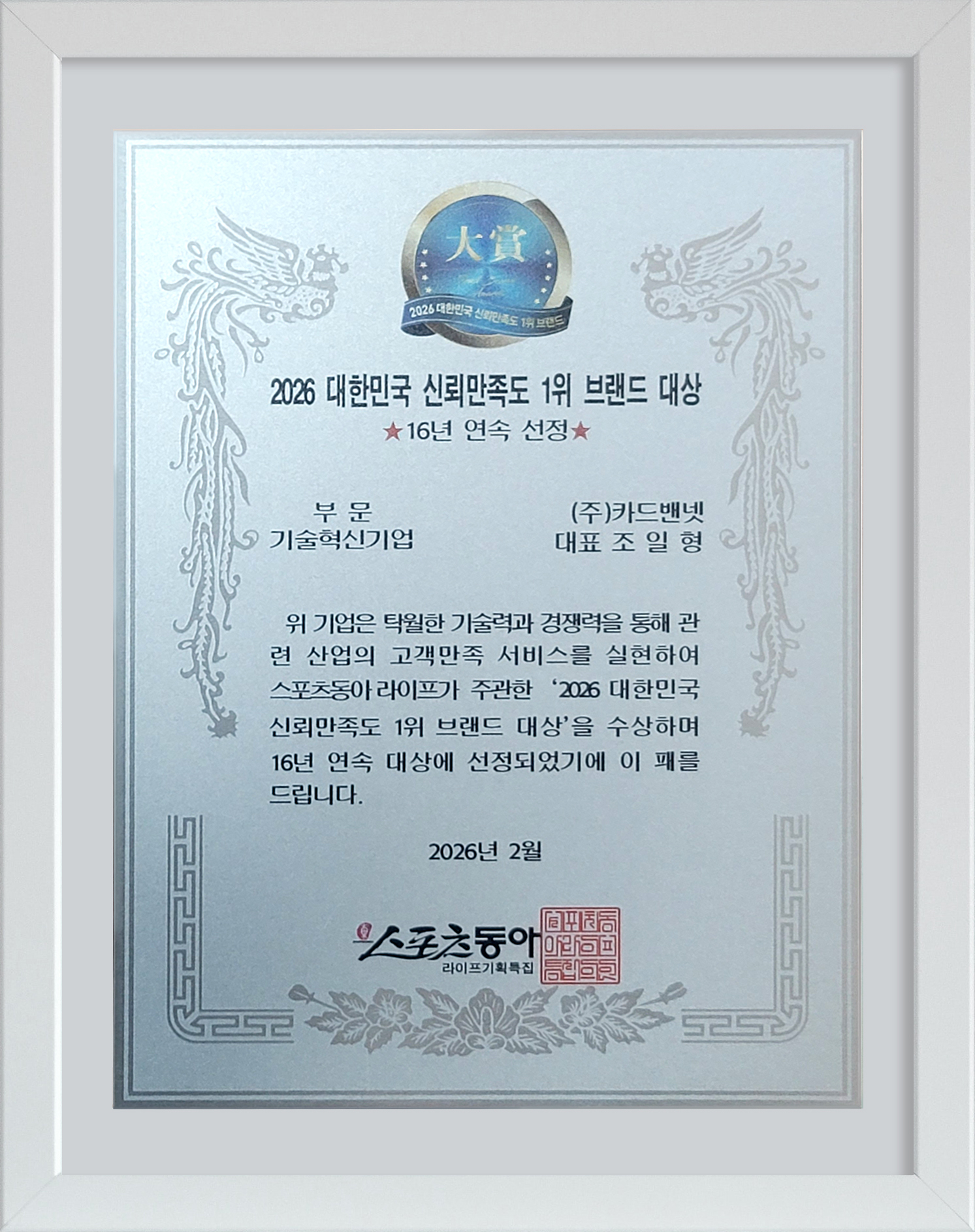 회사소개 Home 회사소개 회사소개포스·키오스크테이블 오더·서빙로봇유선카드단말기무선카드단말기비대면결제 고객지원센터 신규문의 수상이력 CEO 인사말회사연혁수상이력카드밴넷 소식오시는길 회사소개 CEO 인사말 회사연혁 수상이력 카드밴넷 소식 오시는길 수상이력 실시간 설치 현황 카드밴넷 소식 문의게시판 자료실 제안서 수상이력 공지사항 리뷰 2026 대한민국 신뢰만족도 1위 브랜드 대상 (16년 연속) 2026 대한민국 신뢰만족도 1위 브랜드 대상 (16년 연속) 썸네일 22썸.jpg (대표) 목록