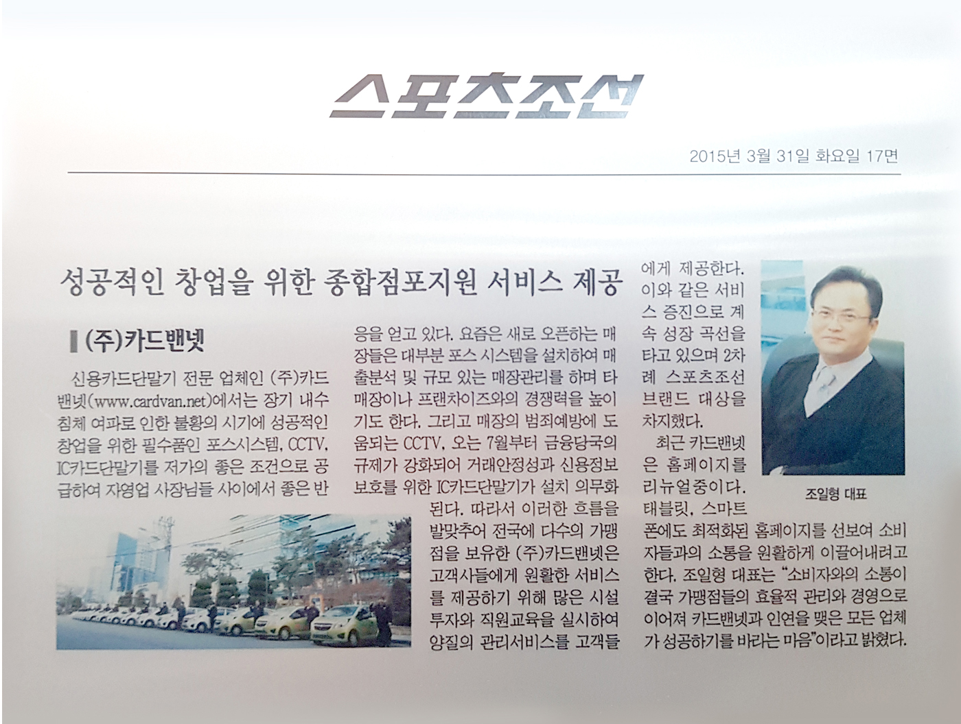 ㈜카드밴넷 회사소개 CEO 인사말 회사연혁 수상이력 카드밴넷 소식 오시는길 포스·키오스크 테이블 오더·서빙로봇 유선카드단말기 무선카드단말기 비대면결제 고객지원센터 매출조회서비스 원격지원서비스 자료실 실시간 설치 현황 신규문의 CATEGORY TOP 회사소개 Home 회사소개 회사소개포스·키오스크테이블 오더·서빙로봇유선카드단말기무선카드단말기비대면결제 고객지원센터 신규문의 카드밴넷 소식 CEO 인사말회사연혁수상이력카드밴넷 소식오시는길 회사소개 CEO 인사말 회사연혁 수상이력 카드밴넷 소식 오시는길 카드밴넷 소식 실시간 설치 현황 카드밴넷 소식 문의게시판 자료실 제안서 수상이력 공지사항 리뷰 성공적인 창업을 위한 종합점포지원 서비스 제공 스포츠조선 2015.3.31 화요일 17면 썸네일 소식 6썸.jpg (대표) 목록